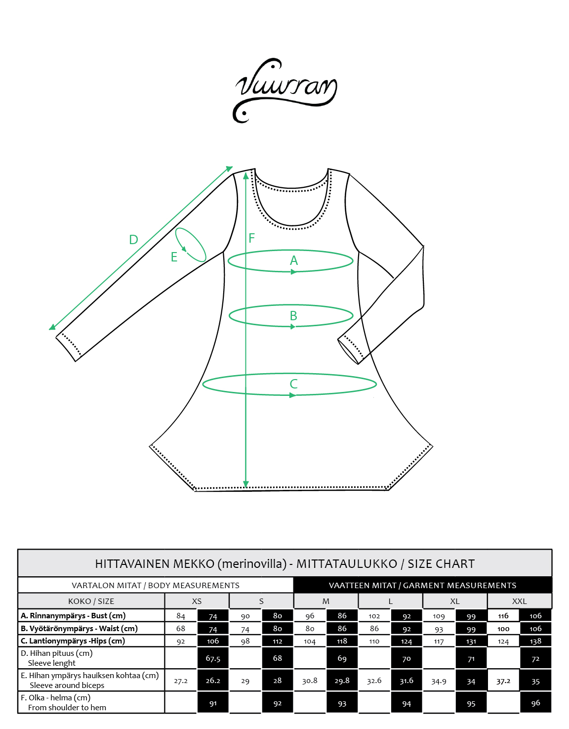 Mittatalukossa on valkoisella pohjalla kaavoituksessa käyttämäni vartalon mitat sekä mustalla pohjalla vaatteen mitat. Neulos on erittäin joustavaa, siksi rinnanympärysmitta on melko nafti. Sopiva koko on hyvä valita rinnanympärys mitan mukaan. Vyötärölle suosittelen vähintään 5-6cm väljyyttä ja lanteille vähintään 10cm väljyyttä, jotta mekko pääsee kevyesti laskeutumaan. Olka-helma mitan avulla voit tarkistaa onko helman mitta sinun vartalollesi sopiva.