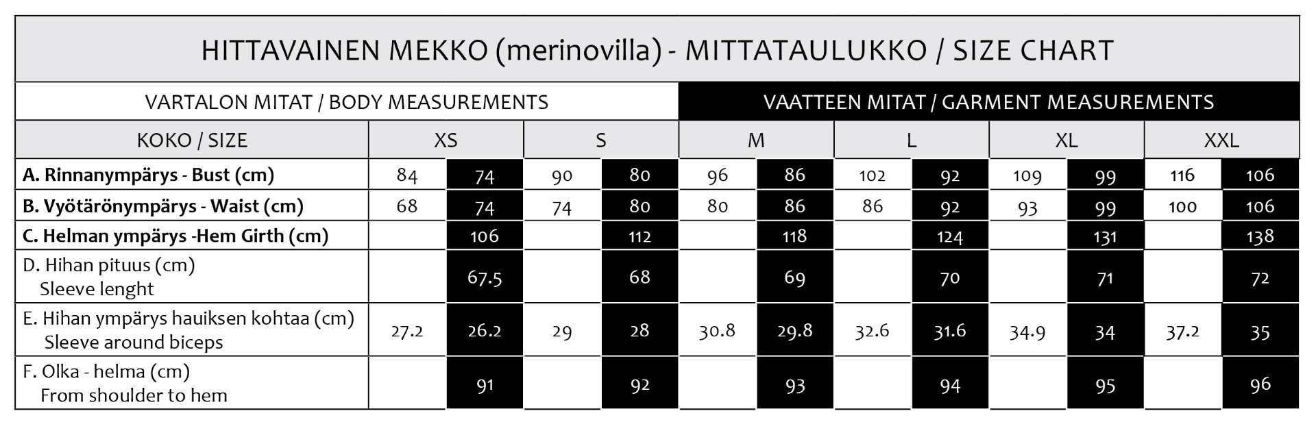 Kuvissa on vaatteen tasokuva, jossa on mittanuolet havainnollistamassa mistä kohtaa vaatteen mitat on otettu. Neulos on erittäin joustavaa, siksi mitat on melko naftit. Sopiva koko on hyvä valita rinnanympärys mitan mukaan. Olka-helma mitan avulla voit tarkistaa onko helman mitta sinun vartalollesi sopiva.