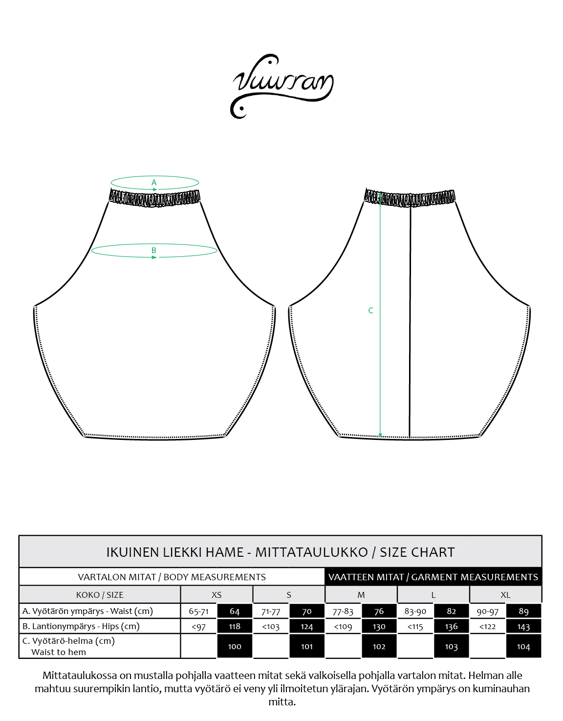 OMILLA MITOILLA JA VÄREILLÄ: Normaalihintaan kuuluu helman pituuden muokkaus sinun mitoillesi. Kirjoita tilauksen lisätietoihin jos haluat hameen lyhyemmällä tai pidemmällä helmalla tai laita viestiä veera@vuurran.fi. Voit kirjoittaa suoraan haluamasi pituuden tai esim. +10cm pituuteen. Voin myös muokata vyötärökuminauhan mittaa jos haluat omalle vyötärölle räätälöidyn pituuden. Suosittelen erityisesti jos vatsasi on herkkä liian kiristäville kuminauhoille. Optimaalinen mitta on 4-5cm vyötärösi mittaa lyhyempi kuminauhan mitta.