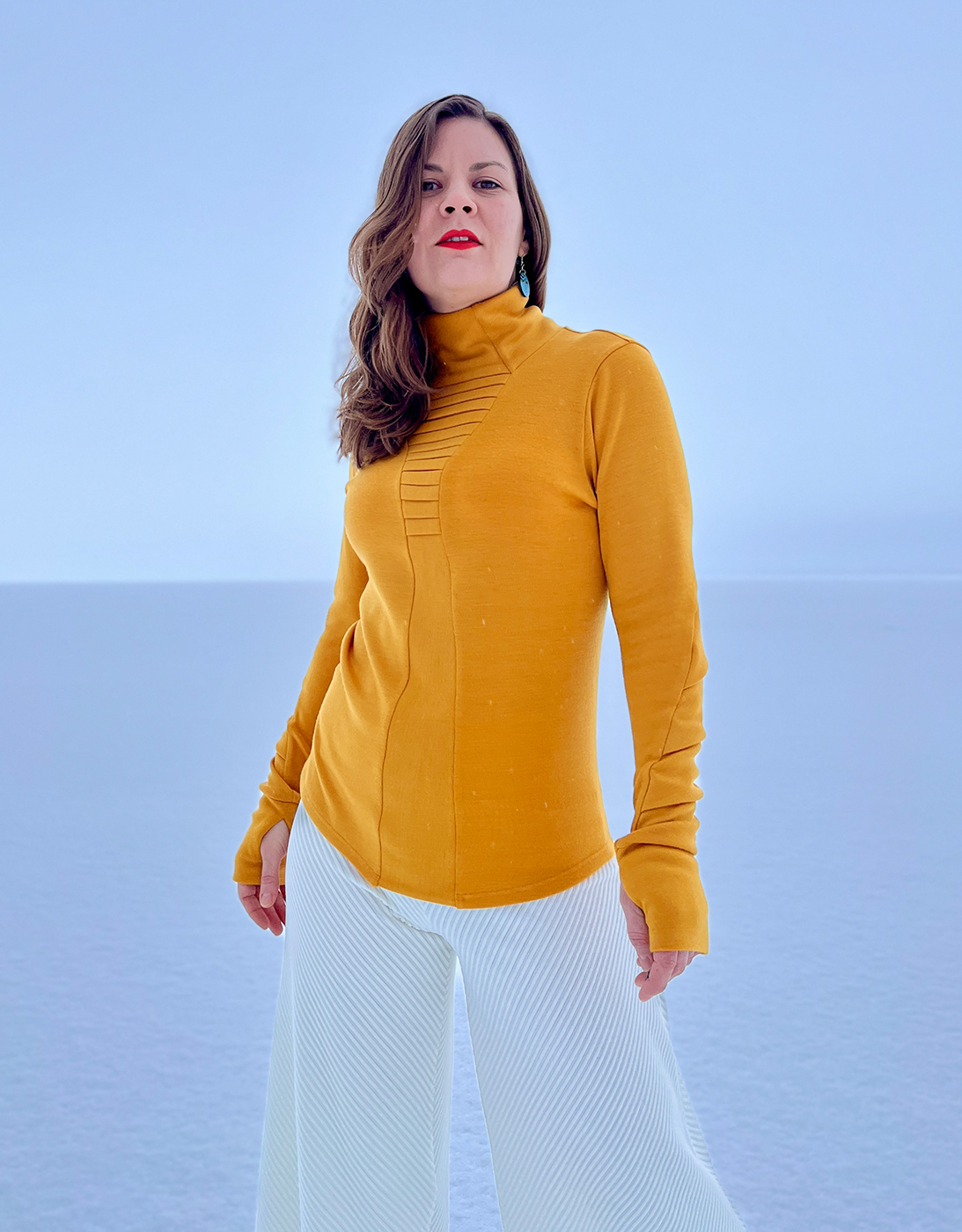 Mekko 100% mulesing-vapaata merinovillaa, joka on neulottu Suomessa Orivedellä Orneuleella. Villakuitu tulee Uruquaysta ja kehrätään langaksi joko Italiassa tai Romaniassa. Erittäin joustavaa keskipaksua interlock-neulosta 250 g/m².