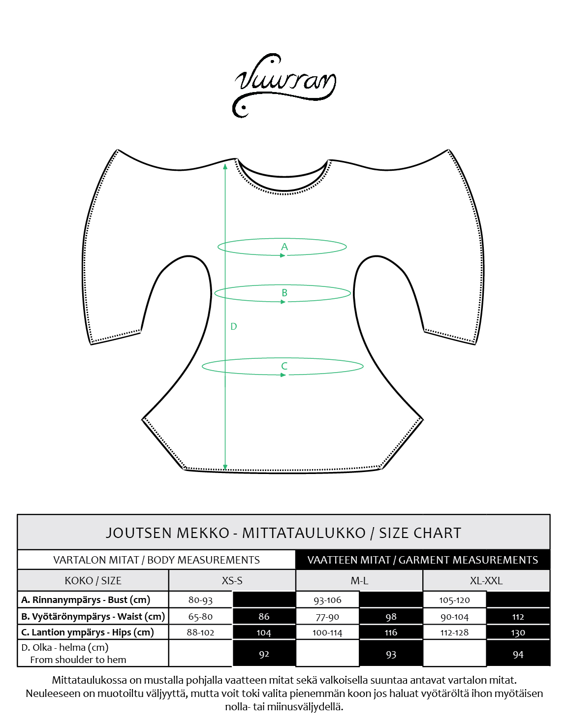 Mittataulukossa on mustalla pohjalla vaatteen mitat sekä valkoisella pohjalla suuntaa antavat vartalon mitat. Neuleeseen on muotoiltu väljyyttä, mutta voit toki valita pienemmän koon jos haluat vyötäröltä ihon myötäisen nolla- tai miinusväljydellä.