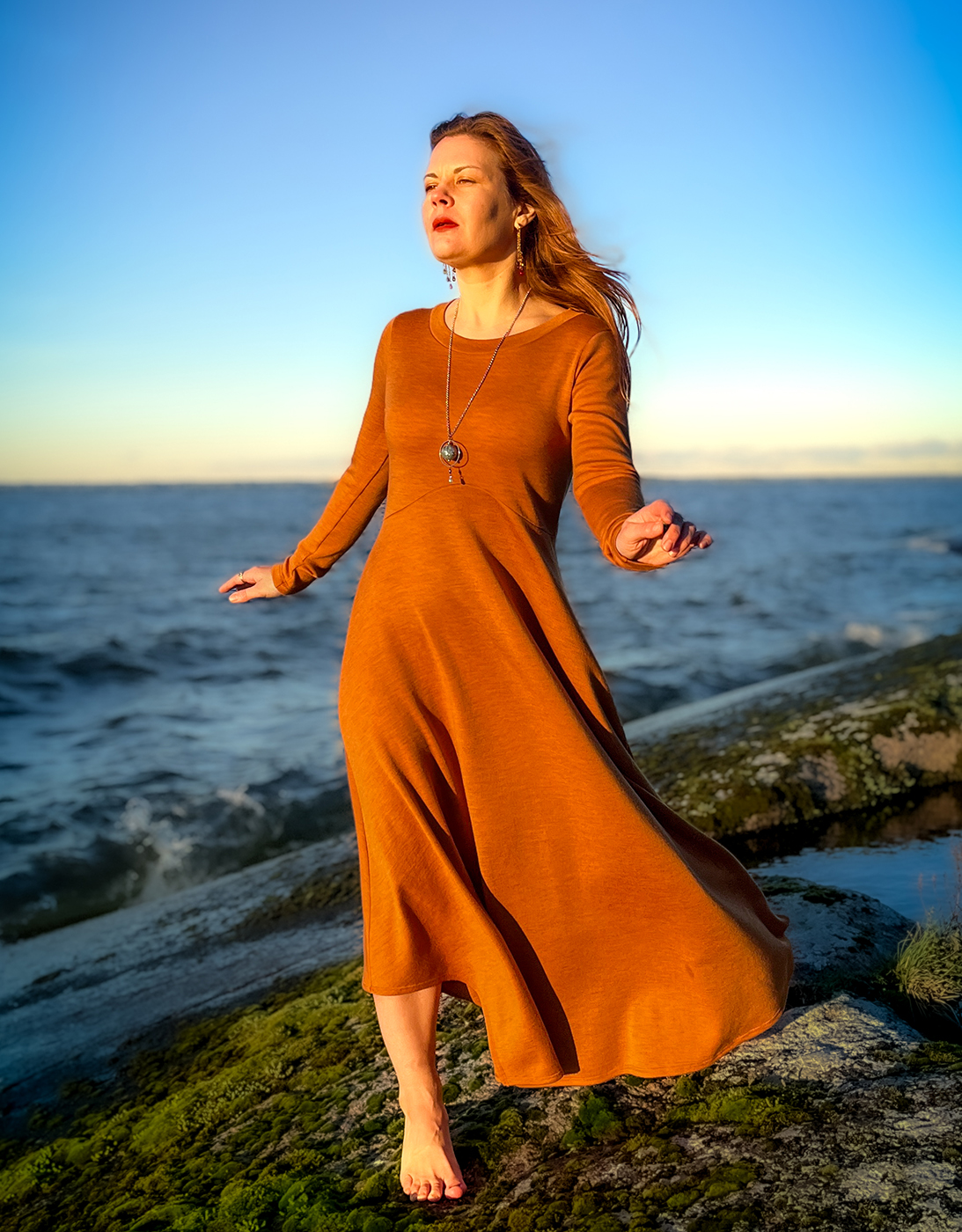 OMILLA MITOILLA: Kirjoita tilauksen lisätietoihin tai laita viestiä veera@vuurran.fi, jos haluat tilata mekon pidemmällä tai lyhyemmällä helmalla. Voit kirjoittaa suoraan haluamasi pituuden tai esim. +10cm pituuteen. Myös hihojen pituuden muokkaus onnistuu. Pääntievaihtoehtoja on Tuonen tyttö mekon kilpikonnakaulus sekä Kokkolintu mekon avarampi venepääntie. Laita viestiä ja kerro mitä toivoisit, jotta mekko tuntuu omalta. Värivaihtoehtoja on kuun hopean lisäksi meripihka, tummanvihreä, verikivi ja musta.
