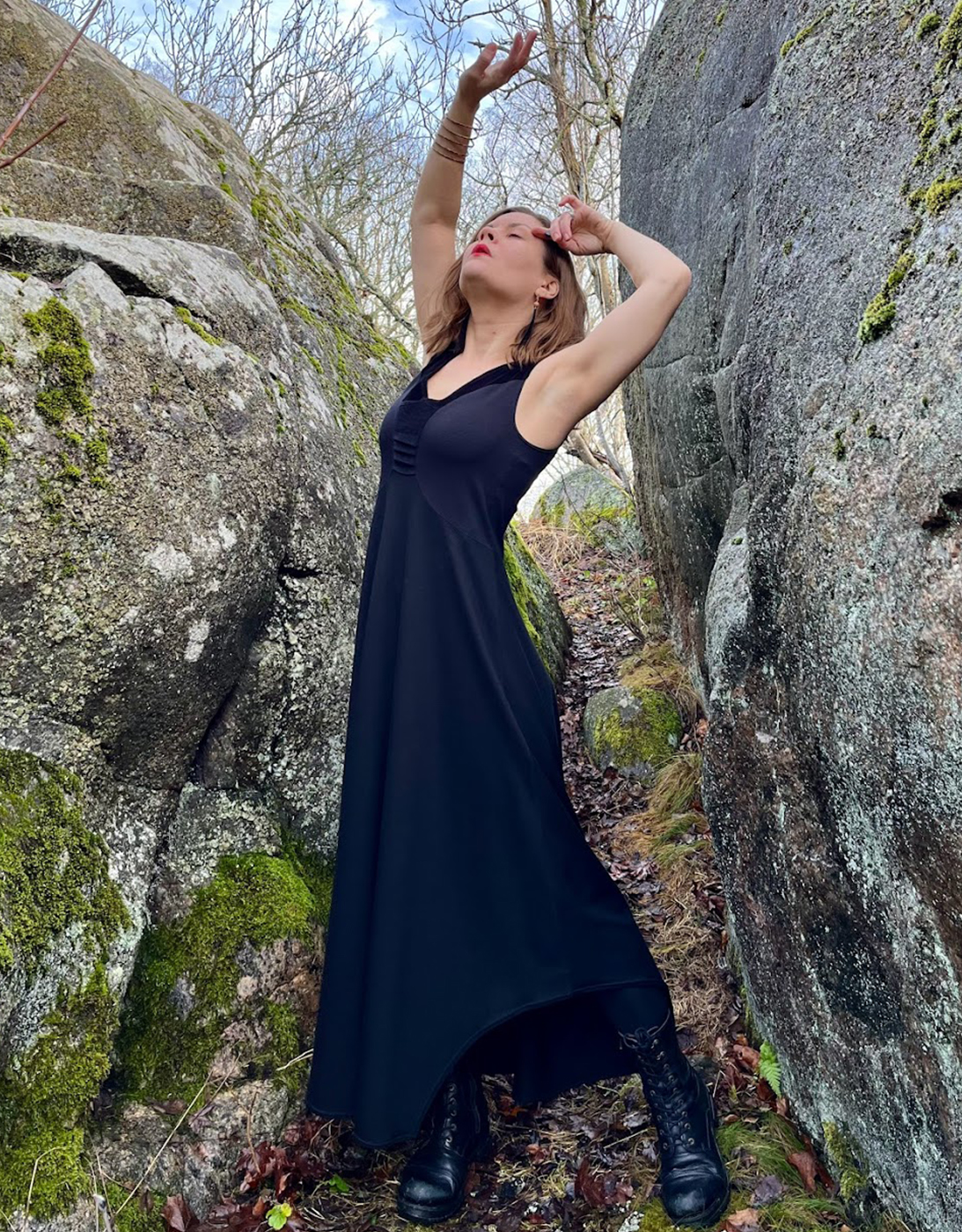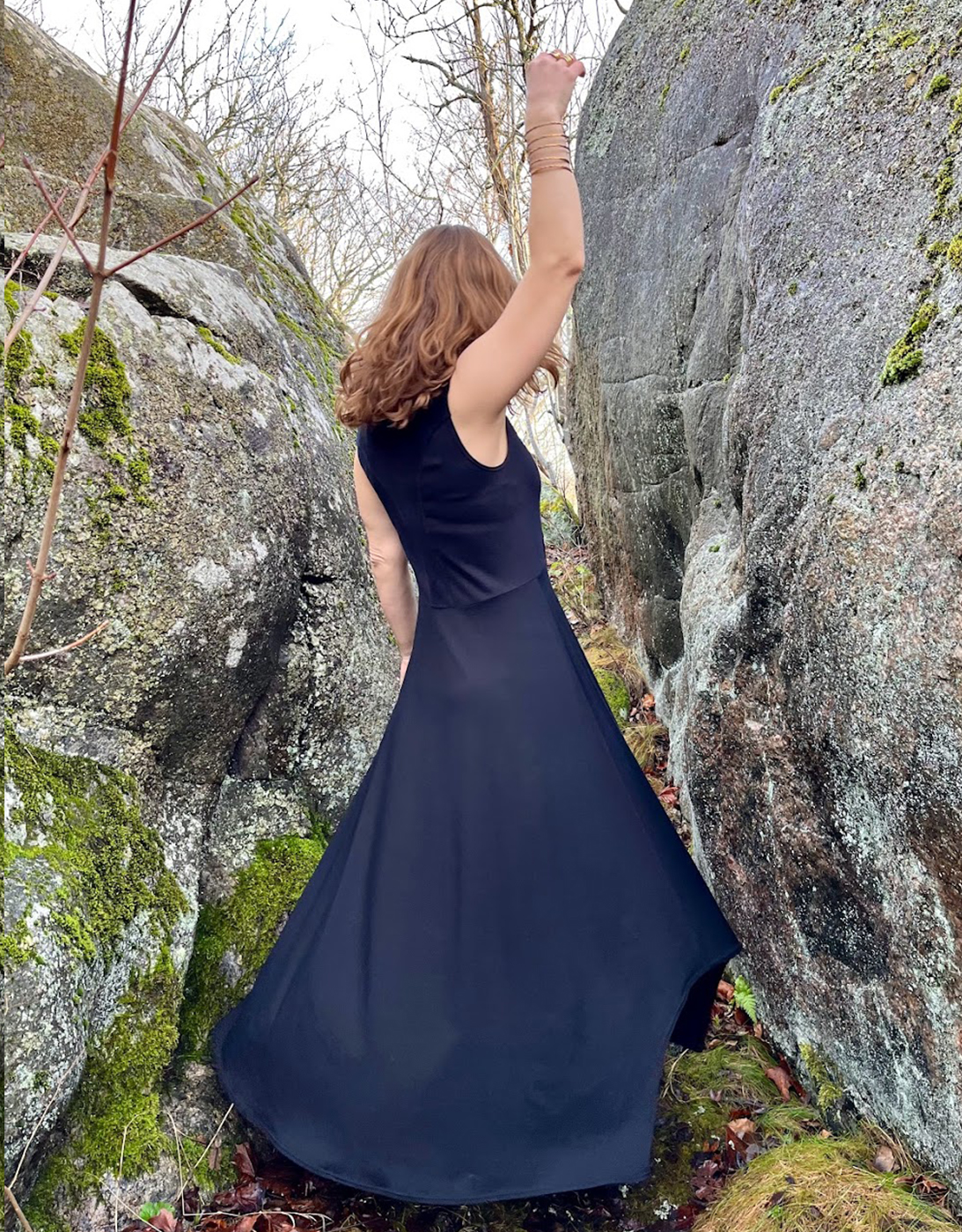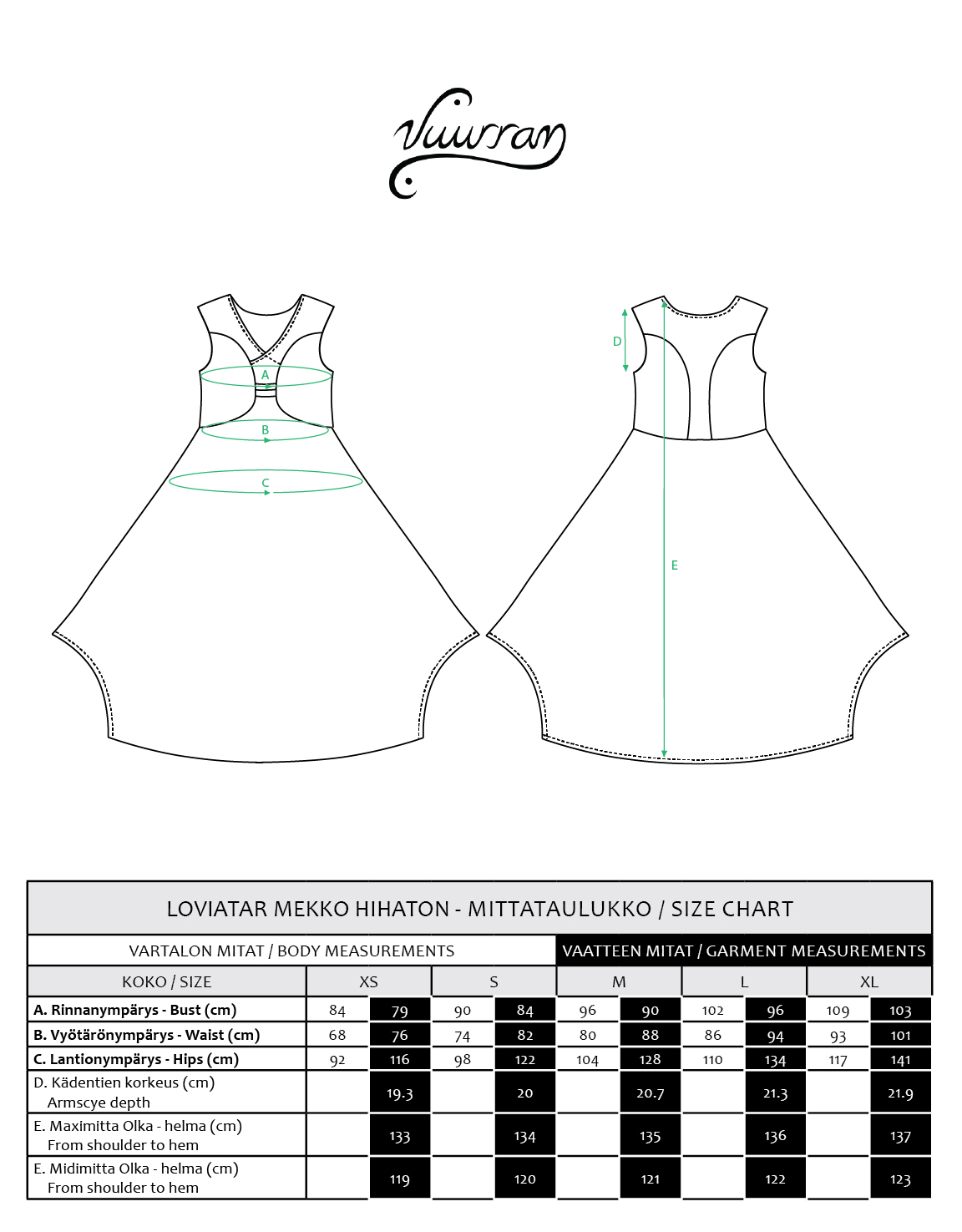 MITTATILAUS OMILLA MITOILLA: Tämä malli valmistuu ainoastaan mittatilauksena. Normaalihintaan kuuluu helman pituuden muokkaus sinun mitoillesi. Mittataulukosta löydät kaksi pituusehdotelmaa, täyspitkän maximitan ja säären puoleen väliin yltävän midimitan. Kirjoita tilauksen lisätietoihin tai laita viestiä veera@vuurran.fi, minkä pituisella helmalla mekon haluat. Olka-helma mitan avulla voit tarkistaa, onko mekon mitta sinulle sopiva ja sellainen josta pidät.