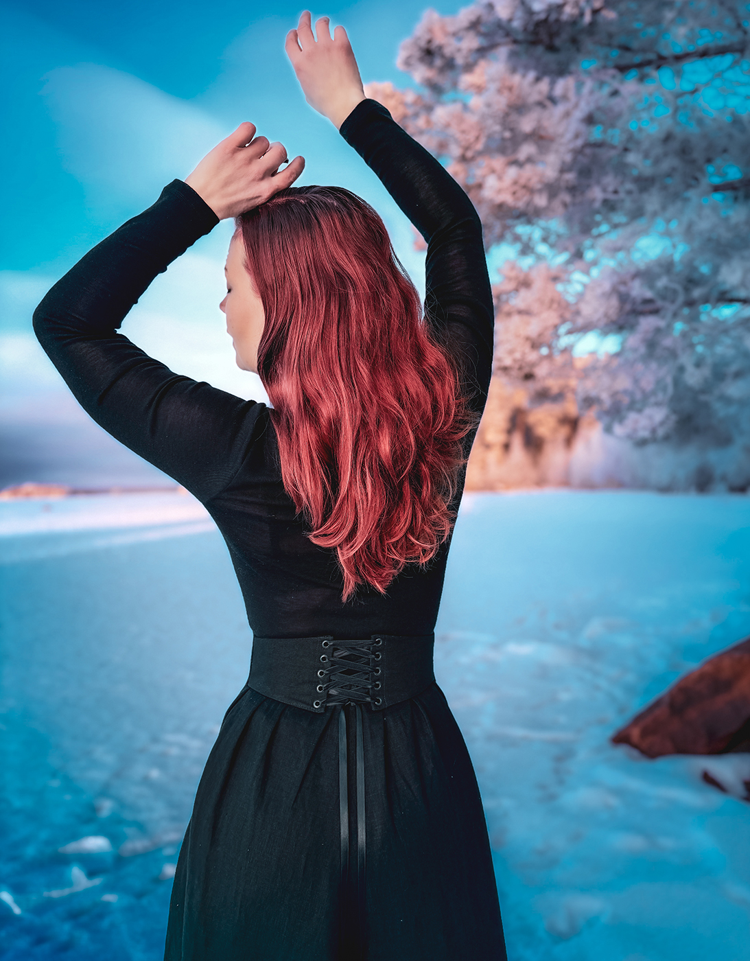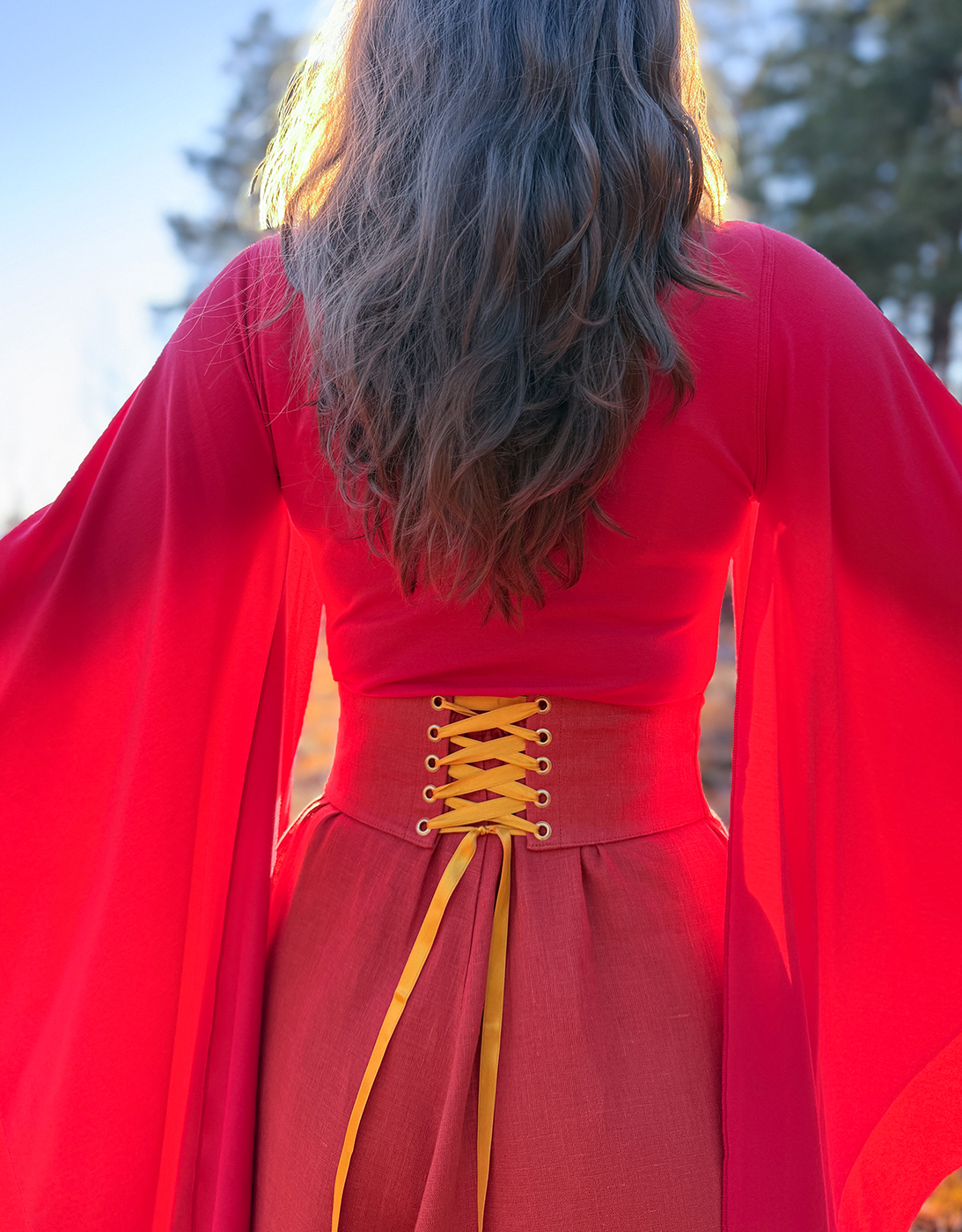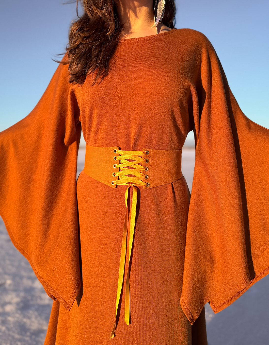 Mittatilauksena myös omalle vyötärön mitalle räätälöity vyö. 7-10cm vyötärönmittaa lyhyempi vyö on suositukseni, riipuen miten leveän nyöritysosion haluat. Vyötä voit pitää myös alempana lanteilla eli mieti sopiva mitta sen mukaan missä kohtaa vartaloa vyötä yleensä käytät.