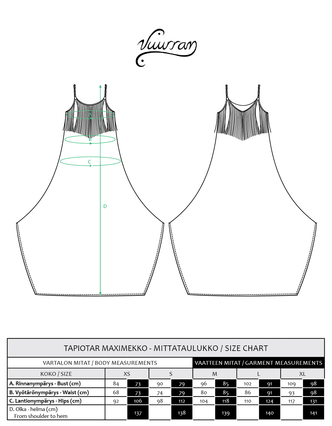 OMILLA MITOILLA: Ompelen nämä mekot tilauksesta, joten erilaiset mittamuutokset onnistuu tarvittaessa. Pyynnöstä saat esimerkiksi helmaan lisää pituutta. Kirjoita tilauksen lisätietoihin, jos haluat mekon lyhyemmällä tai pidemmällä helmalla tai laita viestiä. Voit kirjoittaa suoraan haluamasi pituuden tai esim. +10cm pituuteen. Huomioithan, että mittamuokatuilla vaatteilla ei ole palautusoikeutta, vaan ostopäätös on sitova.