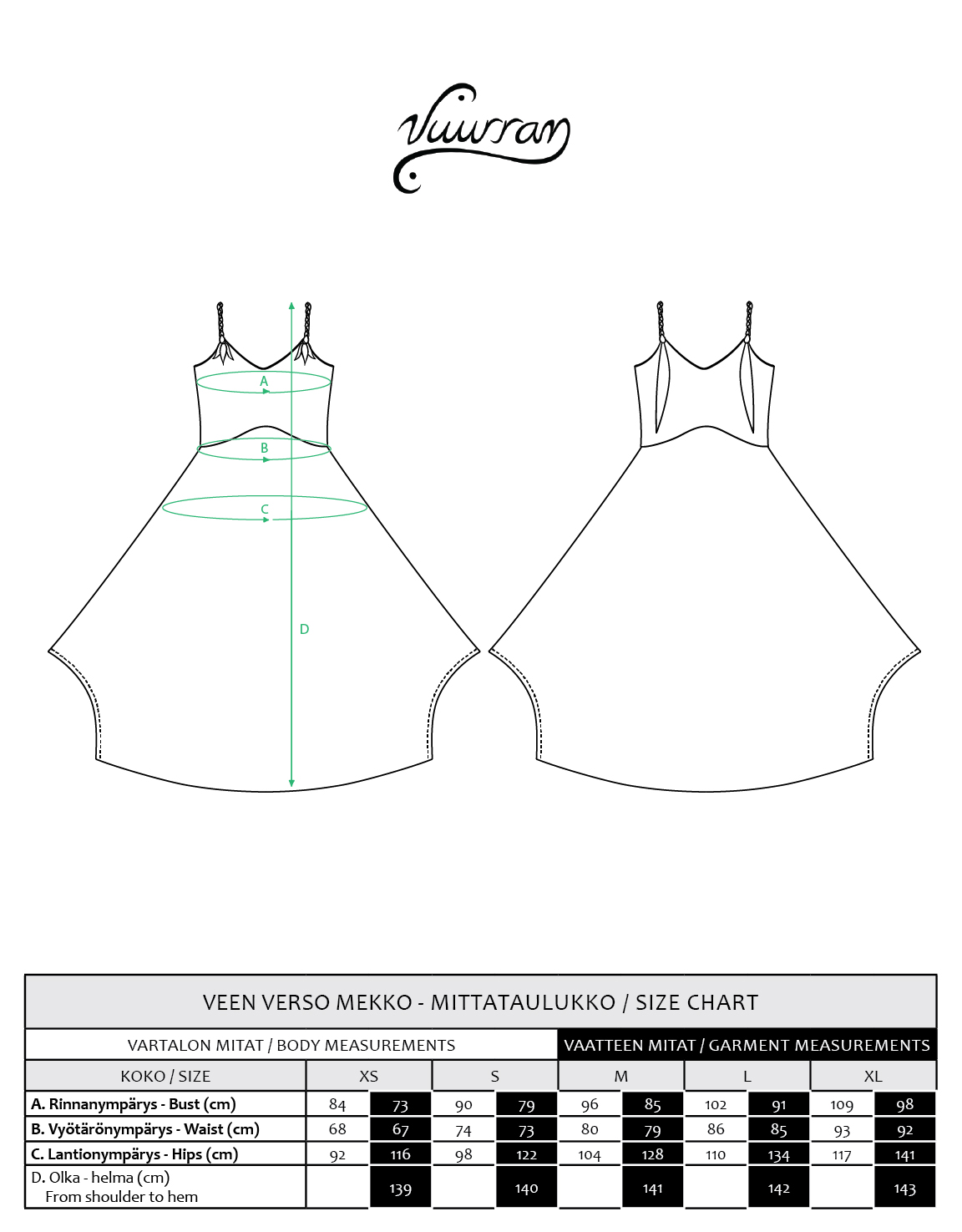 OMILLA MITOILLA JA VÄREILLÄ: Normaalihintaan kuuluu helman pituuden muokkaus sinun mitoillesi. Kirjoita tilauksen lisätietoihin jos haluat mekon lyhyemmällä tai pidemmällä helmalla tai laita viestiä veera@vuurran.fi. Voit kirjoittaa suoraan haluamasi pituuden tai esim. +10cm pituuteen.